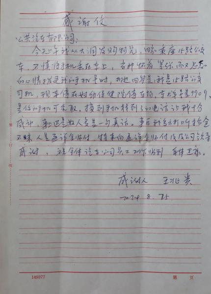 8月25日,市民王先生專(zhuān)程來(lái)到交發(fā)集團(tuán)公交公司客運(yùn)換乘中心將一封感謝信交于工作人員手中,對(duì)15路駕駛員孟祥全師傅拾金不昧的善舉表達(dá)誠(chéng)摯的感謝。